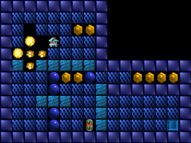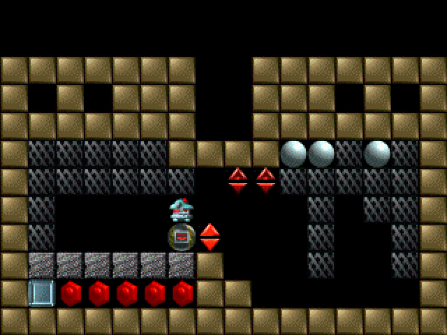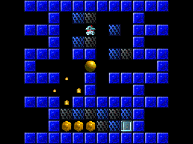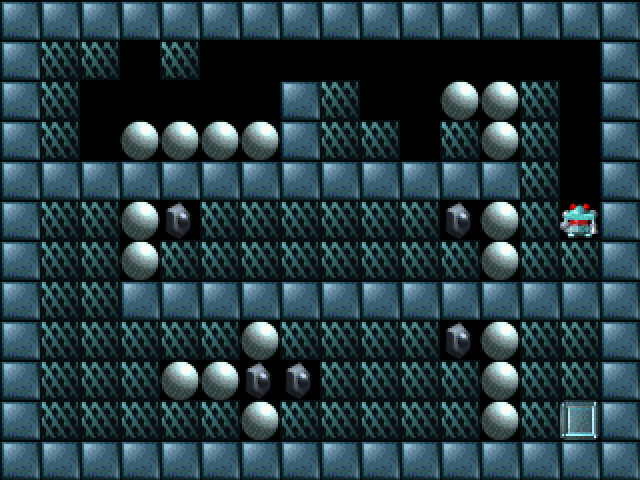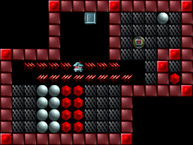 This is a very clever variation on the Boulder Dash formula where you need to solve puzzles by moving around a robot and collecting items, while various objects bloc your way and must be rearranged so that the path is clear. This involves but is not limited to taking apart stacks of stone balls, strategically blowing up explosives, using teleporters and so on. If anything falls on top of the robot or if it's caught in an explosion, you'll have to restart the level; however, there is no time limit to solve any given puzzle. Unlike some other Boulder Dash clones, each level/puzzle takes up one screen. The graphics are pre-rendered but look nice, even though there's some odd colour dithering applied to the sprites. The music and sound effects are pretty good and give off a futuristic vibe. There are 20 levels in the shareware version making up a complete zone called Cyberium (not related to Tiberium). The full registered game has four zones and 80 levels. Additionally, a separate collection of levels for kids was also available.
