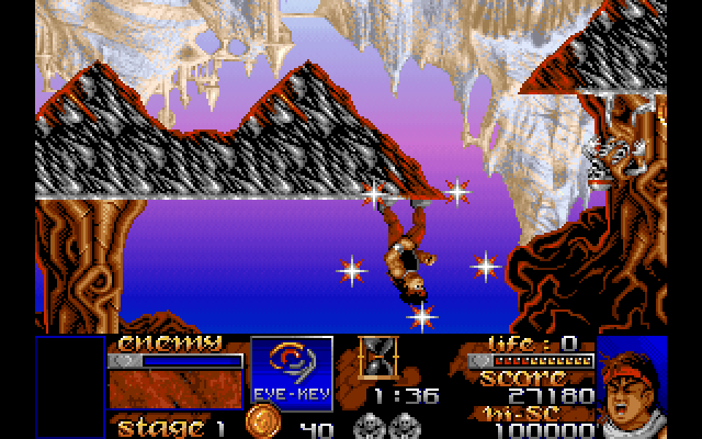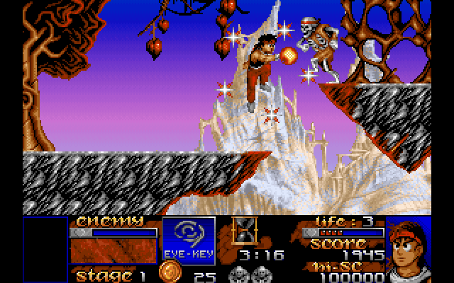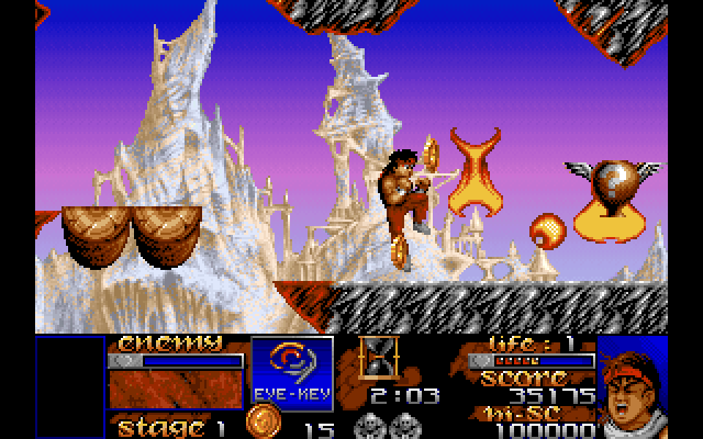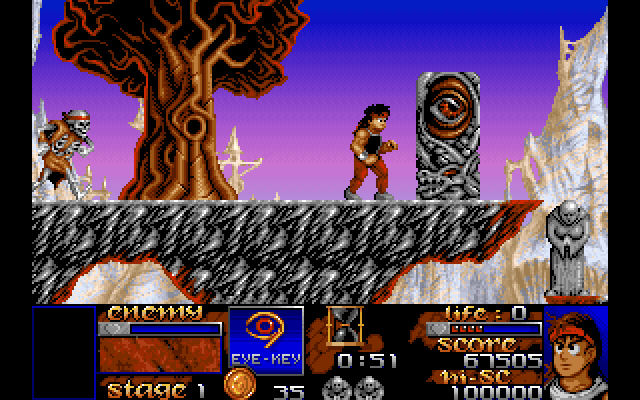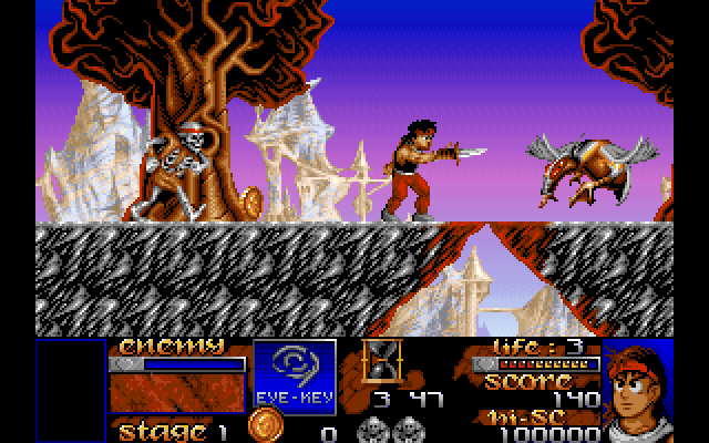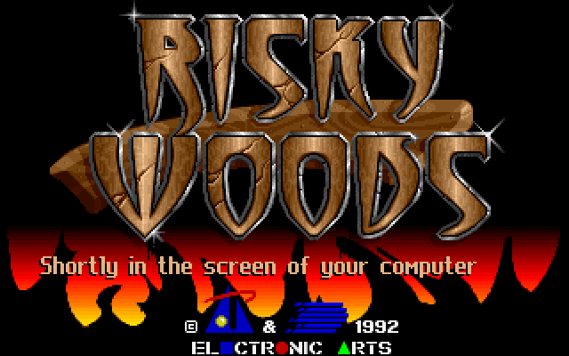 Risky Woods is a side-scrolling arcade platform game that leans somewhat into beat-'em-up and shooter territory. The main character is an Asian martial arts master-looking dude (think of an anime version of Liu Kang) armed with an endless supply of throwing knives, whose mission apparently takes him through an outlandish looking forest densely packed with undead and other hostile monsters that assault him from all sides. These enemies (the bulk of which takes but one hit) often drop coins when destroyed, which you need to kneel down to pick up, and others even larger treasure pouches, usually filled with several coins. Sometimes you can find treasure chests falling from trees, filled with more exotic powerups and even power-downs, one of which will temporarily flip the screen upside-down, like in Prince of Persia. The game has a distinct Amiga-esque look, and appears to have been originally developed for that platform. The playable pre-release demo contains one level. There is a limited amount of time given to reach the exit.