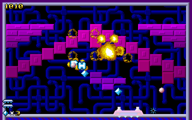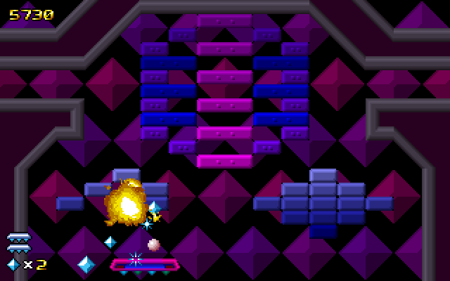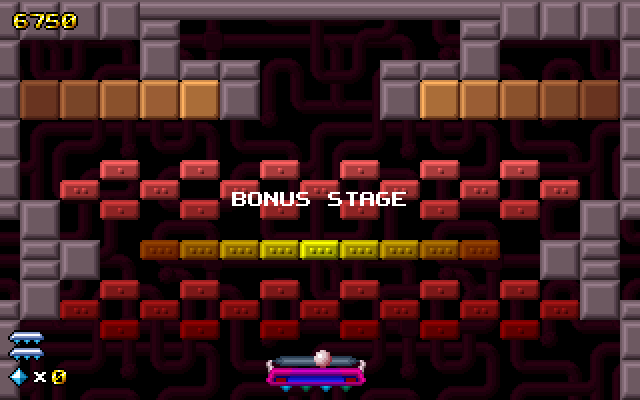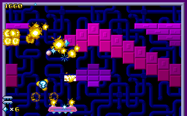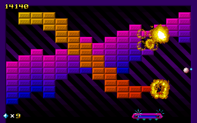The object of the game is to bounce a ball against bricks, destroying them and accumulating points. The ball must not make its way past your paddle, which you control using a mouse. Whenever the ball hits your paddle, it bounces back up at an angle relative to the place that the ball hits the paddle at. Knowing this, the ball can be aimed at targets, and with a little practice this becomes easy. Each board consists of an arena with walls and bricks. The paddle is at the bottom of the arena which is open.