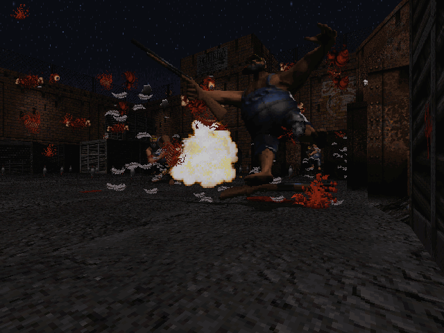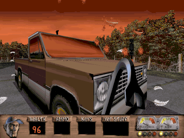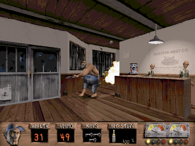 Leonard and Bubba gotta get back Bessie, their prize-winnin' pig who's been abducted by aliens in Redneck Rampage, a ruckus-raisin' riot of a first person 3D shooter set in the fictional town of Hickston, Arkansas. Armed with up to nine impractical and occasionally illegal weapons ranging from a crowbar to an alien arm gun (to pull the trigger, yank on the tendon), blast your way with the boys through country bars and trailer parks. The aliens have been busy conducting experiments, cloning local folks like Hickston's resident drunkard, Billy Ray. Now these ornery alien enemies lurk behind every outhouse and jukebox, scratching themselves and waitin' to whoop yer butt. If you thought navigating through a melted-down Los Angeles or sneaking around ogres' castles was tough, then just try your hand a-whompin' and a-stompin' the good ol' boys at Stanky's Bar & Grill. You'll find there's nothin' more terrifyin' than the deep chuckle of an inbred alien clone stalking you in the backwoods, with nobody to hear your teeth chattering but the fifty chickens milling around underfoot.