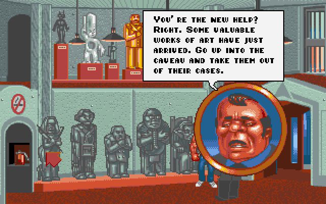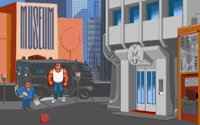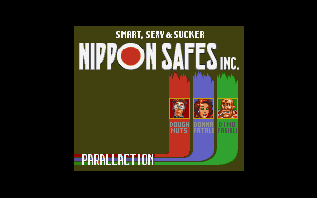 Nippon Safes Inc. is a tongue-in-cheek, point-and-click adventure game from an Italian studio, featuring three different characters - a smart hi-tech safe cracker, a former boxer doing odd jobs, and an exotic dancer - who end up in prison in Tioko (obviously supposed to be Tokyo, Japan) for various misdeeds as the game starts, but are then set free to complete their separate story arcs, before getting to work together in the final chapter of the adventure. The game is controlled entirely via mouse. The left mouse button directs the character, and the right button brings up a menu of available actions and an inventory (combined on a single panel). The only keyboard keys used are S and L for saving and loading the game, respectively, and the space bar, which, unexpectedly, exits back to DOS. The game supports several languages, including English, German and French in addition to the native Italian, selectable at the start. Nippon Safes Inc. was originally a commercial product, but on 17 March 2021 it was officially made freeware by its authors. The game can be played in Windows using ScummVM (please see the links section below).