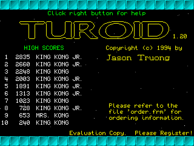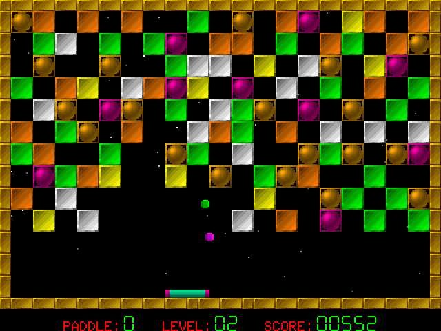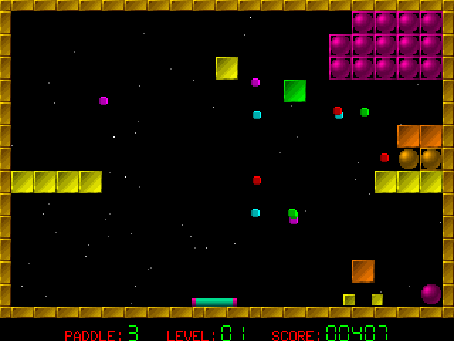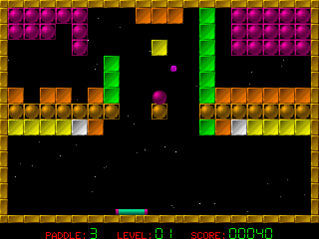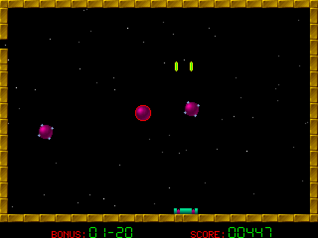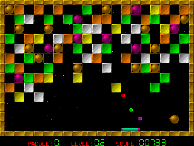 Turoid is a Breakout variant with a few twists. The bricks (which are rectangular here) come in several different colours that indicate the number of hits it takes to break them, but some also contain orbs which will fall down. Of these, a purple orb will instantly break the player's paddle, so these must be avoided, but golden orbs contain various bonuses and should be picked up. Sometimes, additional purple orbs fall from the ceiling. This gameplay feature is somewhat similar to Brixor, but here, gameplay is more smooth, albeit as much frantic. Between levels, there are bonus stages where you need to shoot bouncing orbs using a different paddle equipped with lasers. Turoid was sold as shareware. The unregistered version includes just two levels, and a copy of the level editor that does not allow to save user levels.