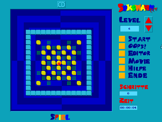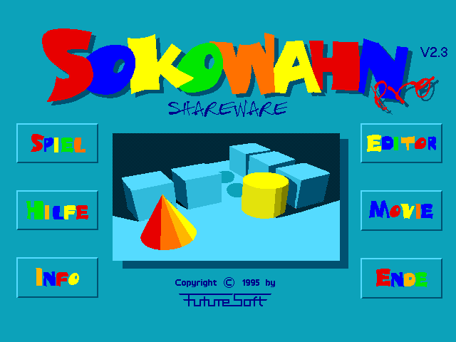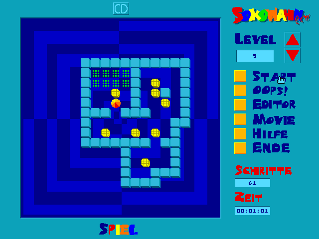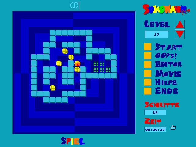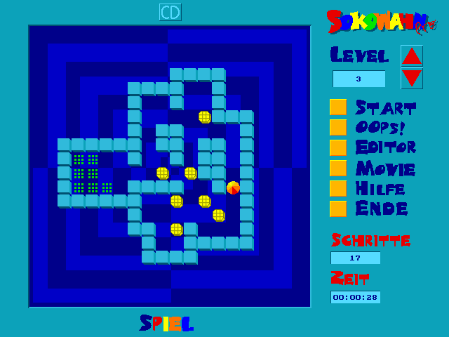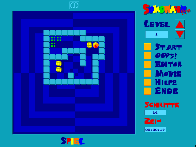 Sokowahn Pro is a Soko-Ban variant with classic rules and simple, colourful high-resolution graphics. Unlike many other games of this kind, all puzzles are completely original, without copying either Soko-Ban or other games, and are sorted by increasing difficulty. However, levels can be played in any order. The game records the time spent on solving a puzzle as well as the number of moves it took the player to do so. The entire playing session may be recorded as a "replay", which can be then shared with other users. There is also a built-in level editor, and a built-in CD player (but no in-game music). Sokowahn Pro was sold is shareware. The unregistered version has 20 levels out of 100 in the full game, giving a sample of the various difficulty stages. There are other limitations, including only one step for the undo function, in the unregistered version. The developer has discontinued Sokowahn Pro and no longer sells it, but the levels are included with other Soko-Ban-like products by the same team. The game is entirely in German, but an English version of the manual is included in the package. The registered version was available in English. Generally, knowledge of German is not required to play.